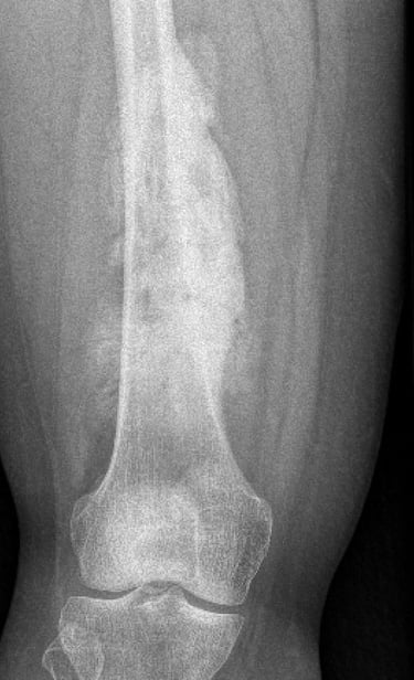 Osteosarcoma is the most common between the ages of 10 to 30 and those > 60 years old. There is no known cause in majority of patients but certain factors are known to increase your risk eg. previous radiotherapy, paget's disease, fibrous dysplasia, bone infarcts or Li Fraumeni syndrome. Most occur around the knee but can occur in any bone. Treatment generally involves combination of chemotherapy and surgery.